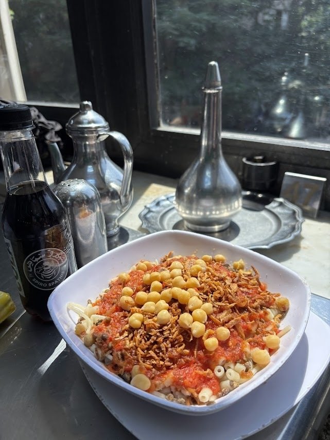 コシャリとは、米・パスタ・ひよこ豆・フライドオニオンを混ぜたものにトマトソースをかけたローカルフードで、日本人の口にも合うシンプルな味わいです。