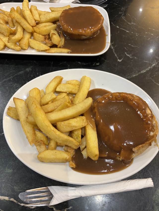 筆者が注文したのは「チキン&マッシュルームパイ」です。画像奥は「マッシュポテト&ひき肉パイ」ですが、見た目は一緒ですね。